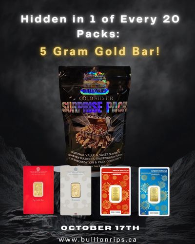 What’s Inside Each Pack? Guaranteed: At least 1 gram of carded gold and 1 oz of silver in every pack! ODDS: GREAT ODDS WITH MORE THAN 1 IN 2 PACKS CONTAINING MORE THAN 292 CAD PRICES IN CANADIAN DOLLAR , VALUES ARE ACCURATE AS MAY 25TH ,2025